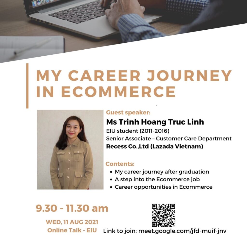 Sáng ngày 11/08/2021, bạn Trịnh Hoàng Trúc Linh (cựu sinh viên khóa 1, Khoa Quản trị Kinh doanh EIU) đã có dịp chia sẻ với sinh viên EIU về hành trình sự nghiệp của bản thân từ khi tốt nghiệp cho đến hiện tại khi đang làm việc trong thị trường thương mại điện tử. […]